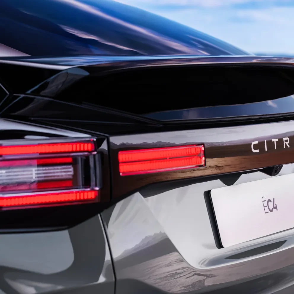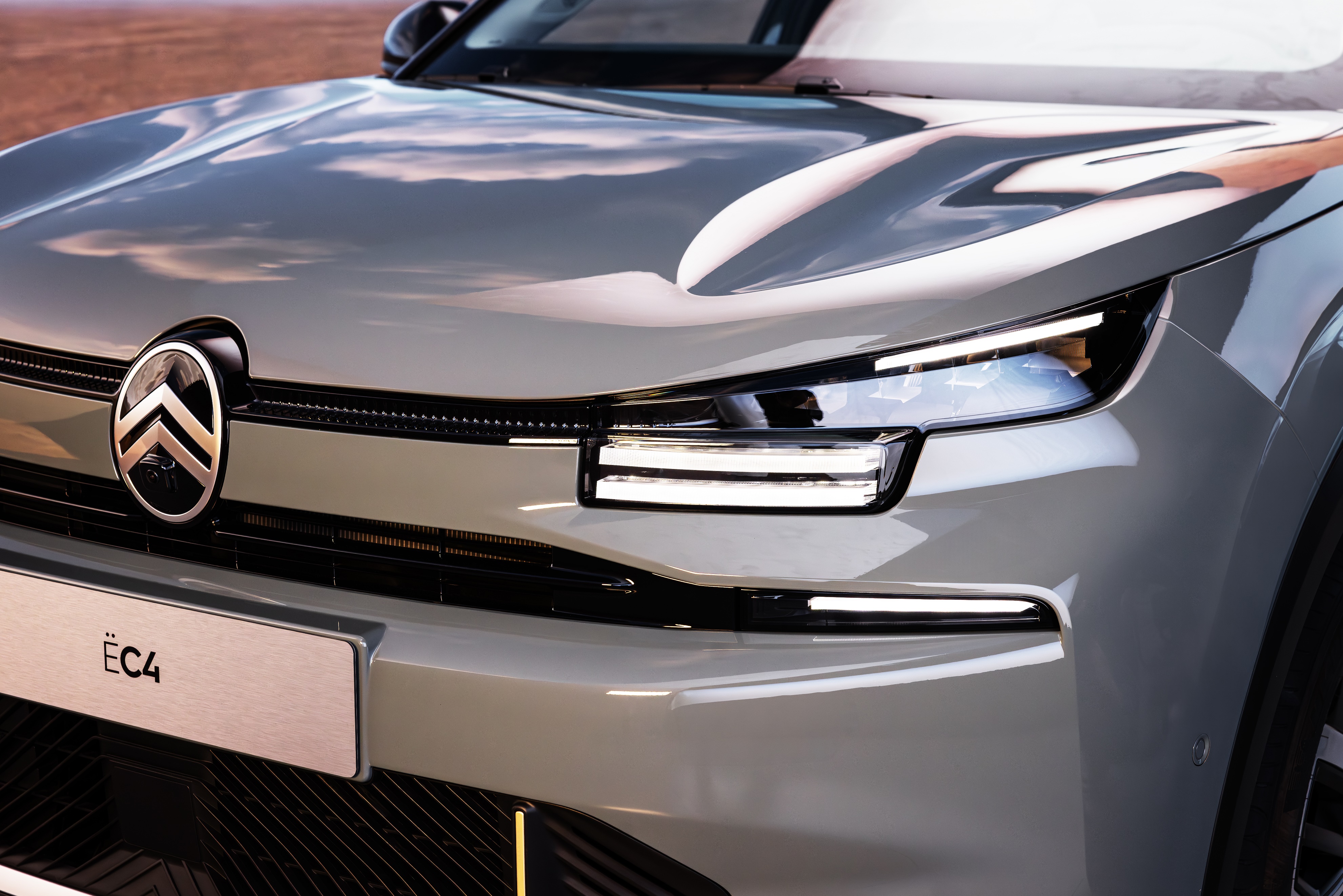 Het hoge voorkomen, de grote wielen en de vloeiende lijnen onderstrepen het vastberaden karakter van de Citroën ë-C4. Onder zijn aerodynamische uiterlijk herbergt hij een zee van ruimte. Zijn voorzijde heeft de nieuwe kenmerkende designelementen van Citroën: de verchroomde chevrons strekken zich uit tot aan de over twee niveaus verdeelde full led-verlichting
