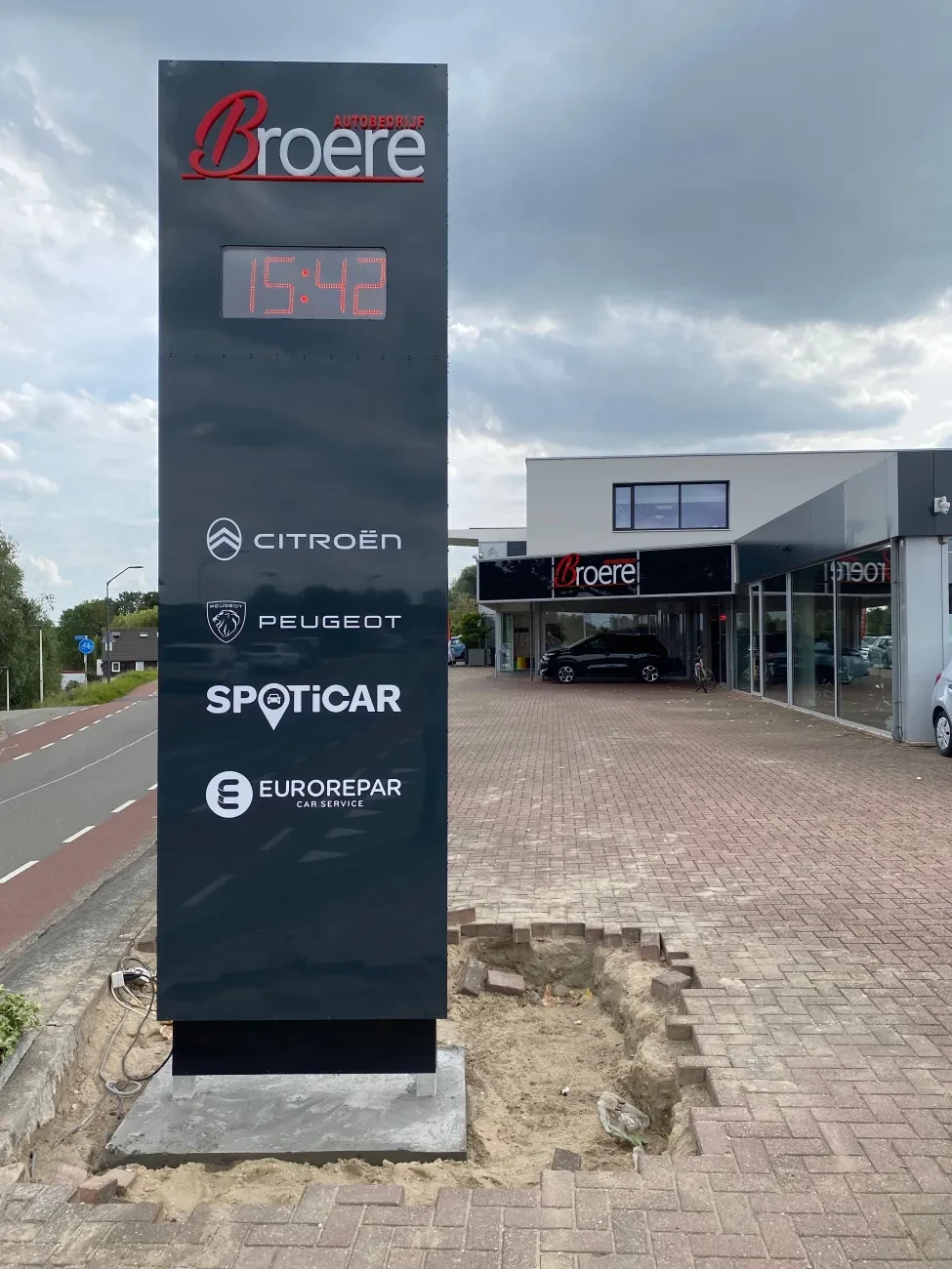 Tot de vorige huisstijl-wijziging in 2010 sierde sinds de jaren '80 een klok ons voorterrein. Na het verwijderen van de klok met temperatuurmeter ontvingen we toen ter tijd veel opmerkingen. We hebben het moment aangegrepen om de klok - in een modern jasje - weer terug te laten keren aan de Lekdijk.